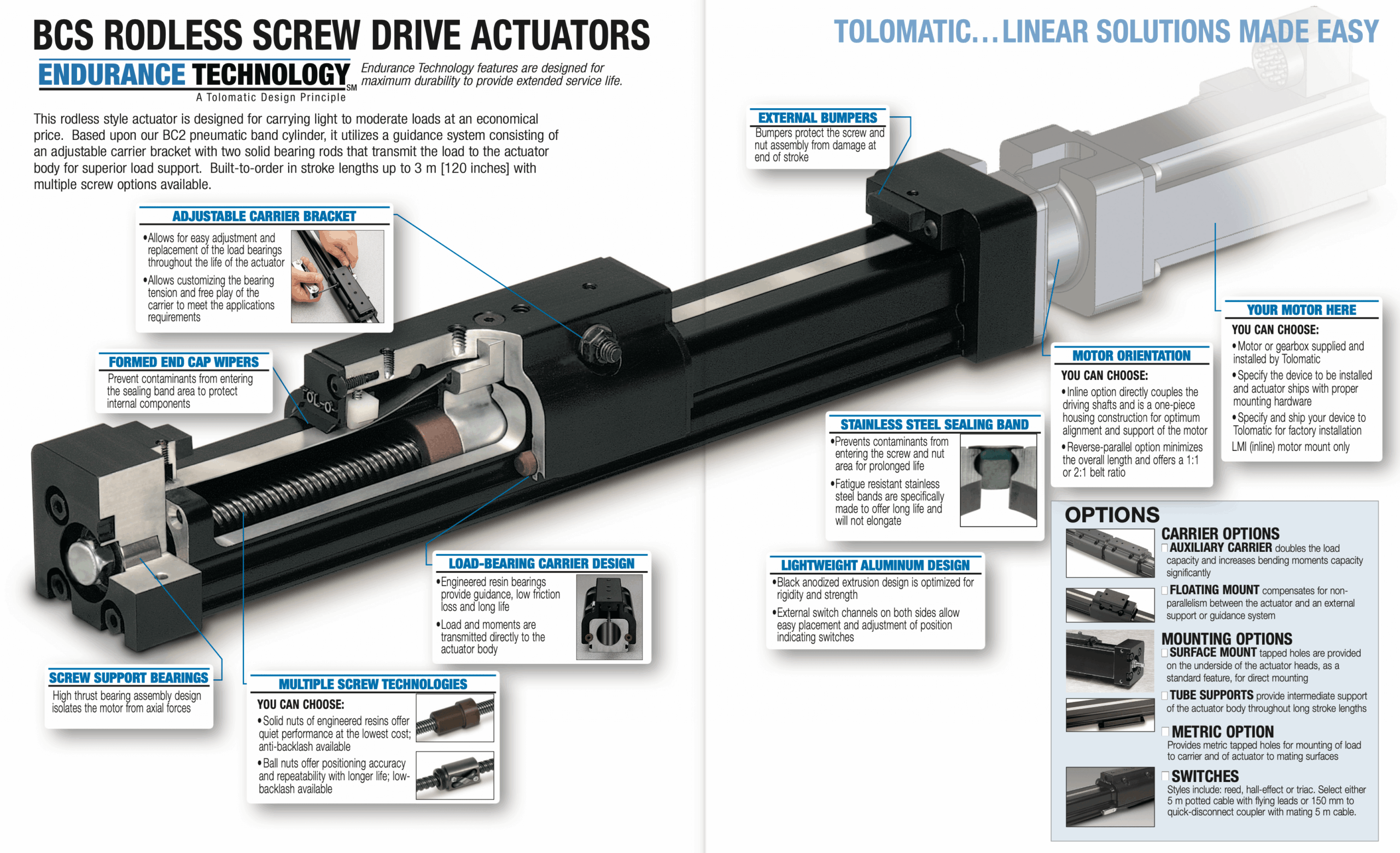 The BCS is a rodless screw drive actuator with light to moderate load capability.