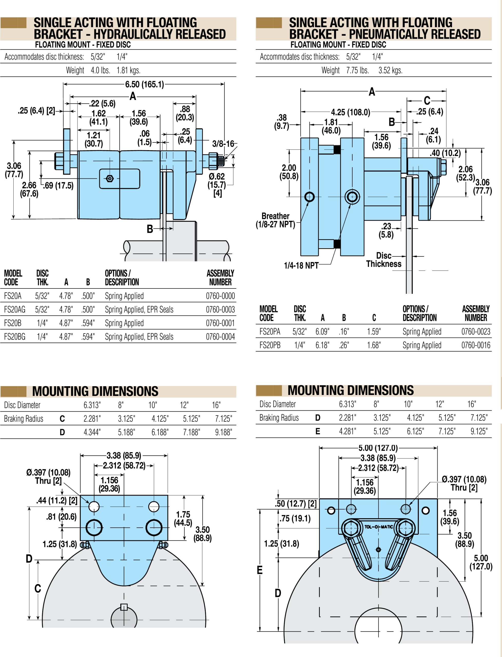 The FS20 spring applied disc brake series provides up to 3250 in-lbs (367 Nm) of static torque (based on linings with no wear). FS20 spring applied disc brakes are single acting and can be specified with either hydraulic or pneumatic disc release. Available in floating mount/fixed disc models.