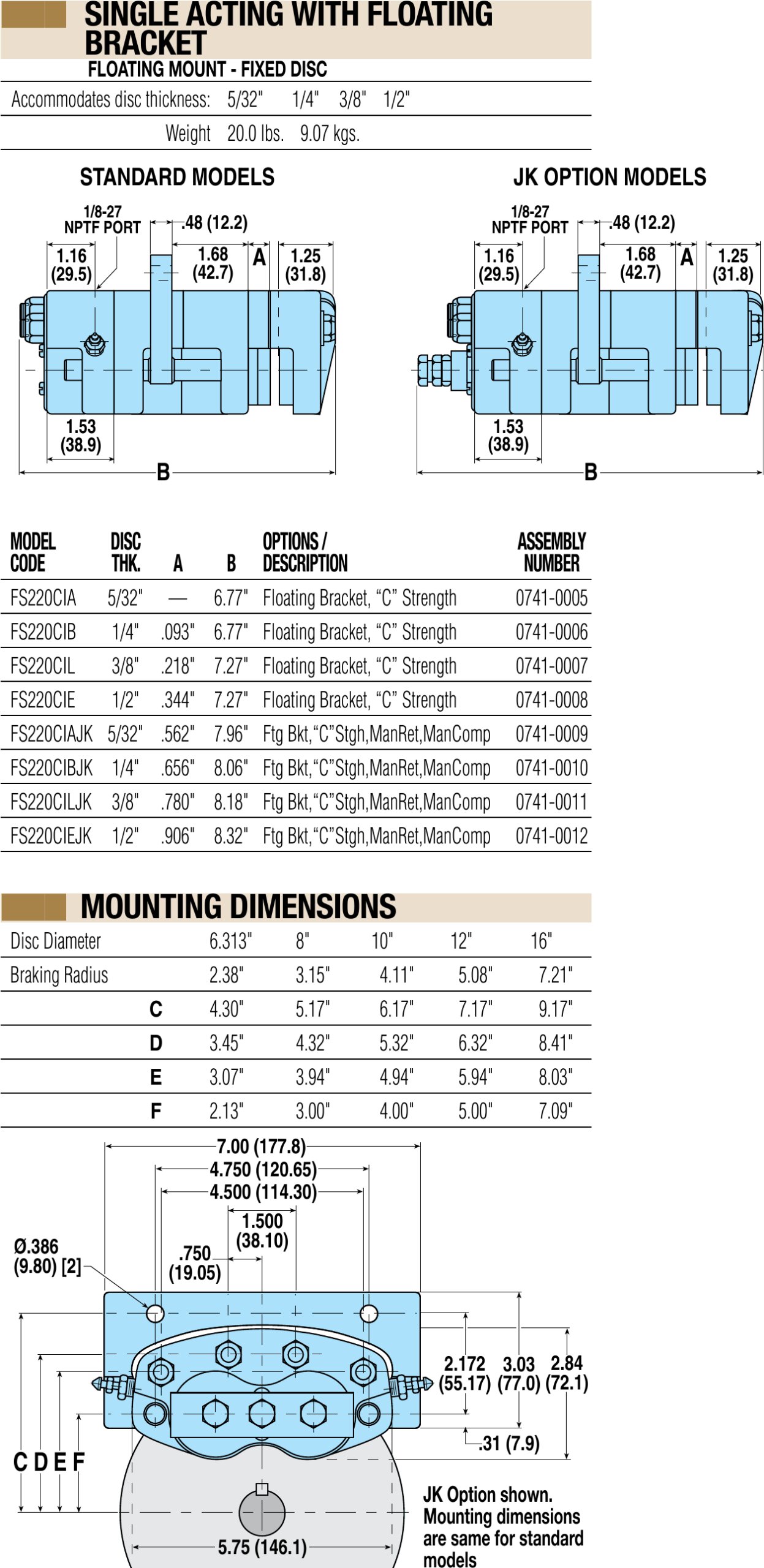 The FS220CI spring applied disc brake series provides up to 13,750 in-lbs (1554 Nm) of static torque (based on linings with no wear). FS220CI spring applied disc brakes are single acting with floating mount and fixed disc.
