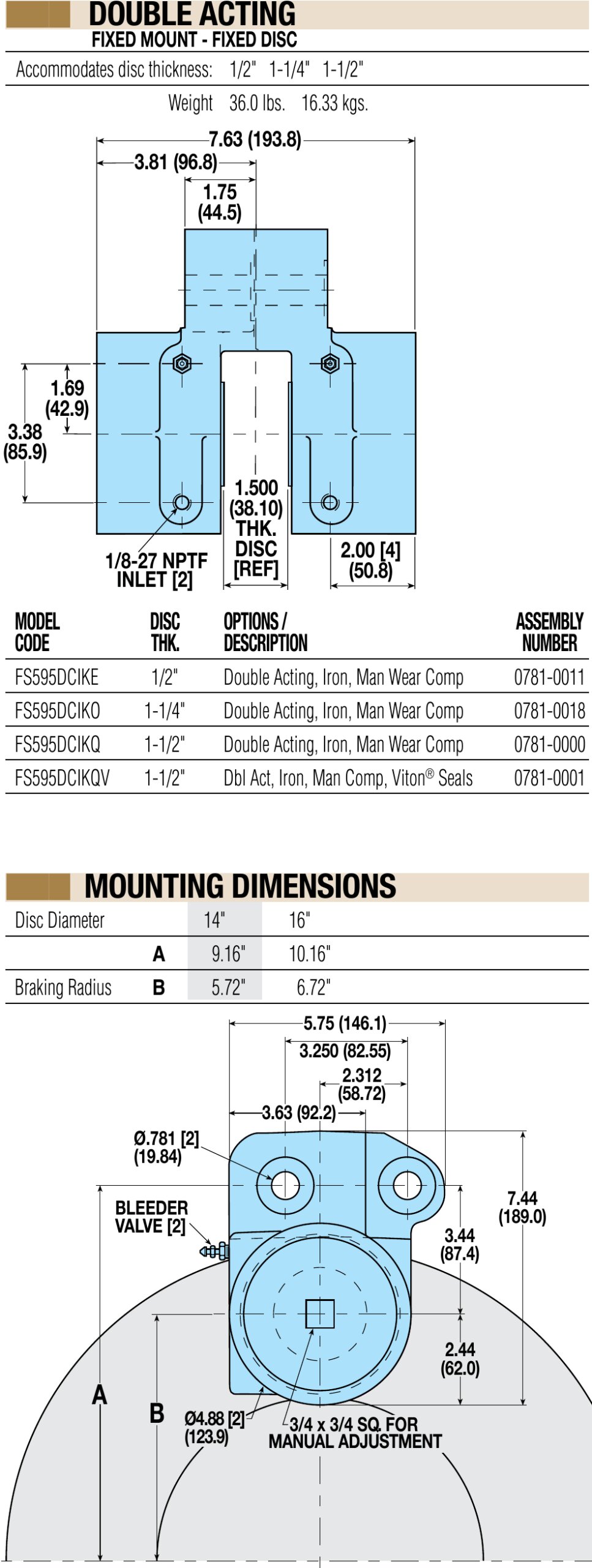 The FS595 spring applied disc brake series provides up to 31,000 in-lbs (3502 Nm) of static torque (based on linings with no wear). FS595 spring applied disc brakes are double acting with floating mount and fixed disc.