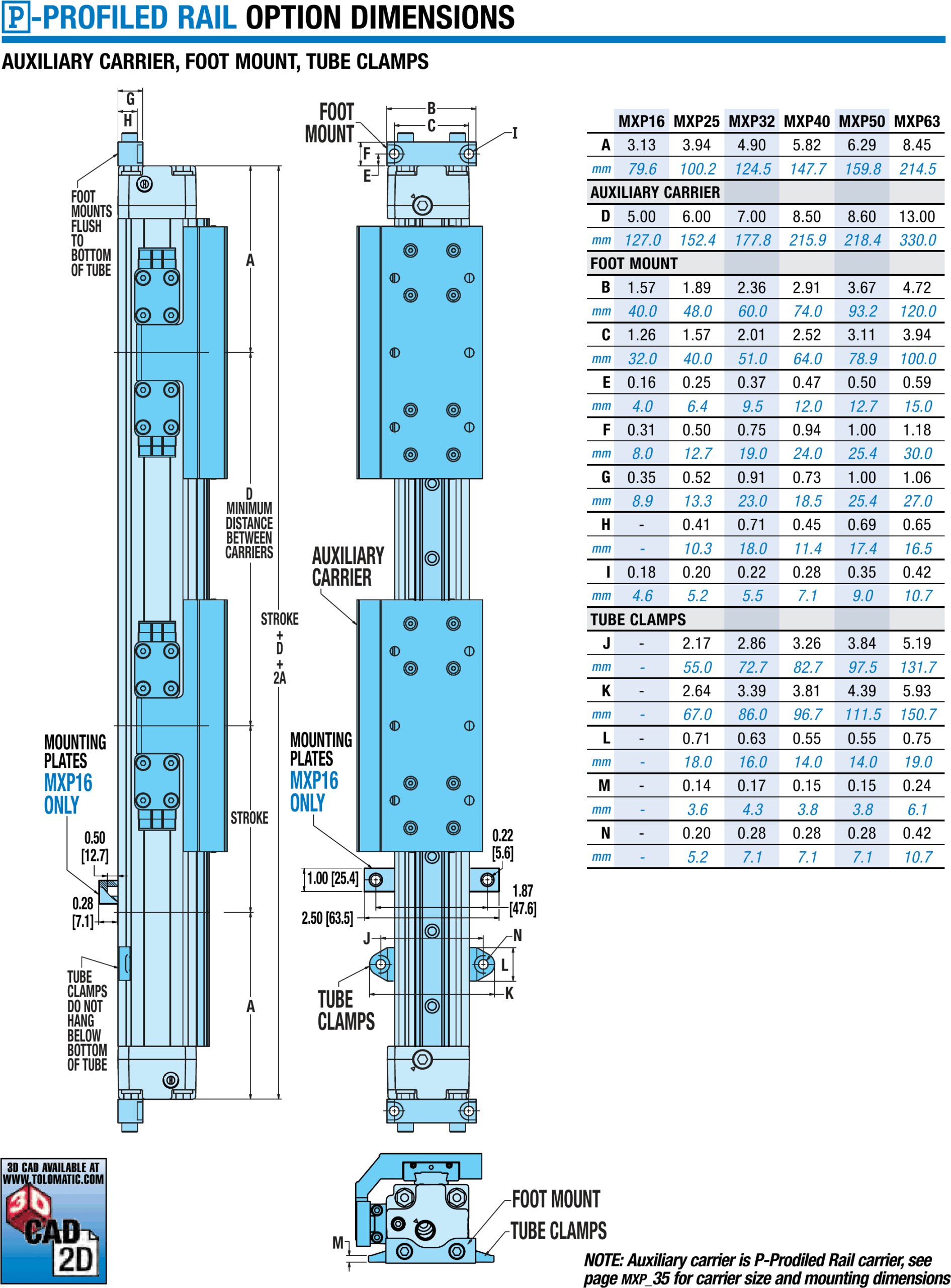 MXP-P Auxiliary Carrier, Foot Mount & Tube Clamp Dimensions