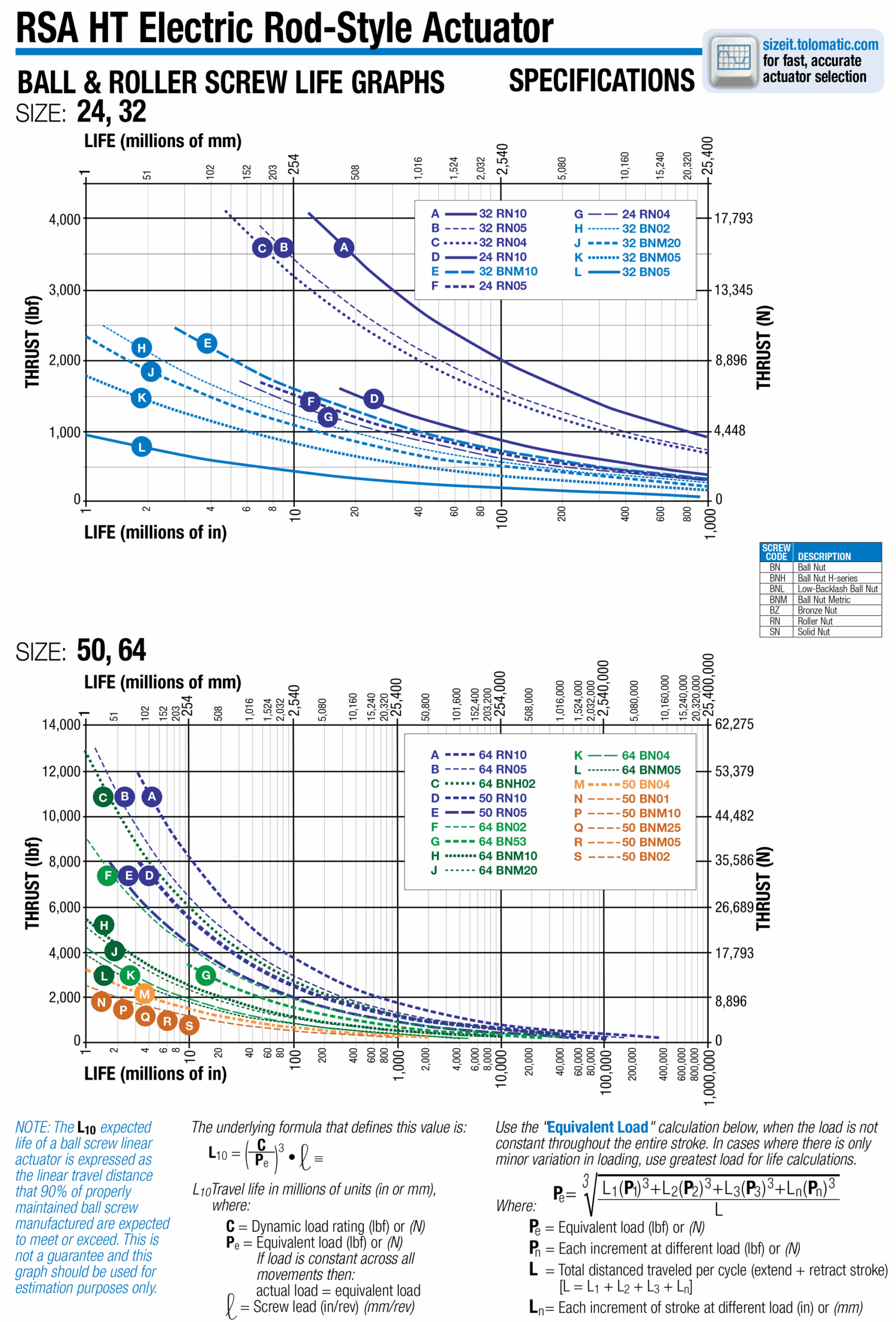 RSA Roller Screw Speed vs Thrust: 24, 32, 50 & 64 sizes